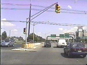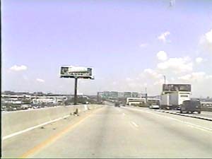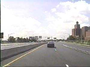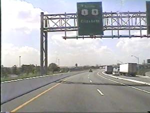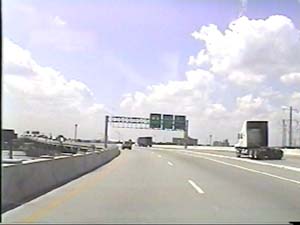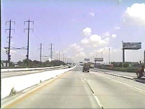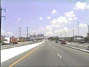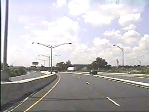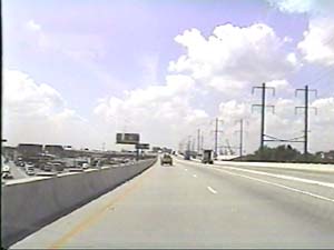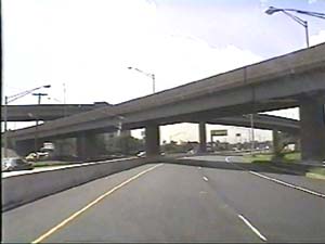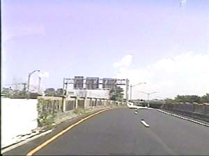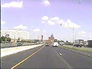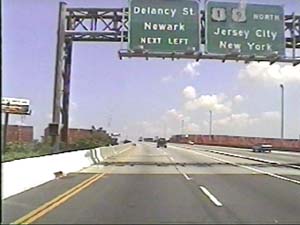 | This is the Pulaski Skyway Approach express lanes, US 1&9 south, north of exit 47(North NJ 21, West US 22, Newark, Newark Airport) in Newark. Filmed August 25, 2000. |