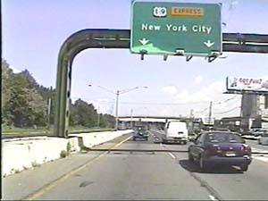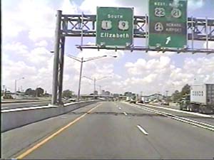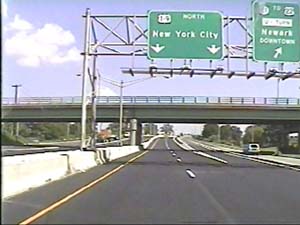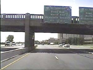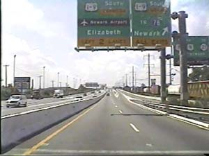 | This is the Pulaski Skyway Approach express lanes, US 1&9 south, at exit 45(I-95, New Jersey Turnpike, Dowd Avenue, North Avenue, Elizabeth Seaport) in Elizabeth. Filmed August 25, 2000. |
