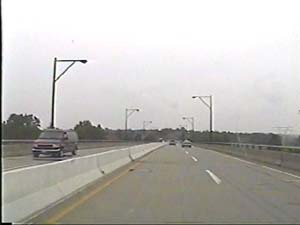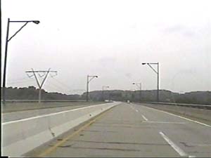 | This is the beginning of the Piedmont Expressway, US 202 north, crossing the Delaware River from New Hope, Pennsylvania into Delaware Township, New Jersey. The Sourland Mountains are visible in the distance. Filmed August 3, 2000. |