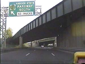 | This is the Edison Bridge Approach, US 9 south, north of exit 132(South NJ 440, To I-287, Industrial Avenue, Smith Street, Perth Amboy) in Woodbridge Township. The Garden Stae Parkway is visible in the median. Filmed May 28, 2001. |