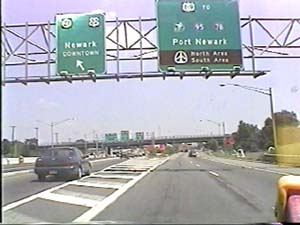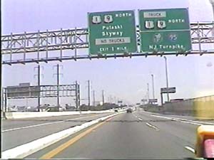 | This is the Pulaski Skyway Approach Local Lanes, US 1&9 south, north of exit 48(I-78, I-95, New Jersey Turnpike, To Garden State Parkway, Port Newark, North Area, Air Cargo) in Newark. Filmed July 22, 2001. |