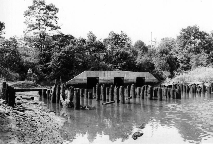 Here is the site of the railroad trestle today. The railroad tracks run over the embankment in the center of the photo. The pilings in the creek may be the remains of the original trestle.