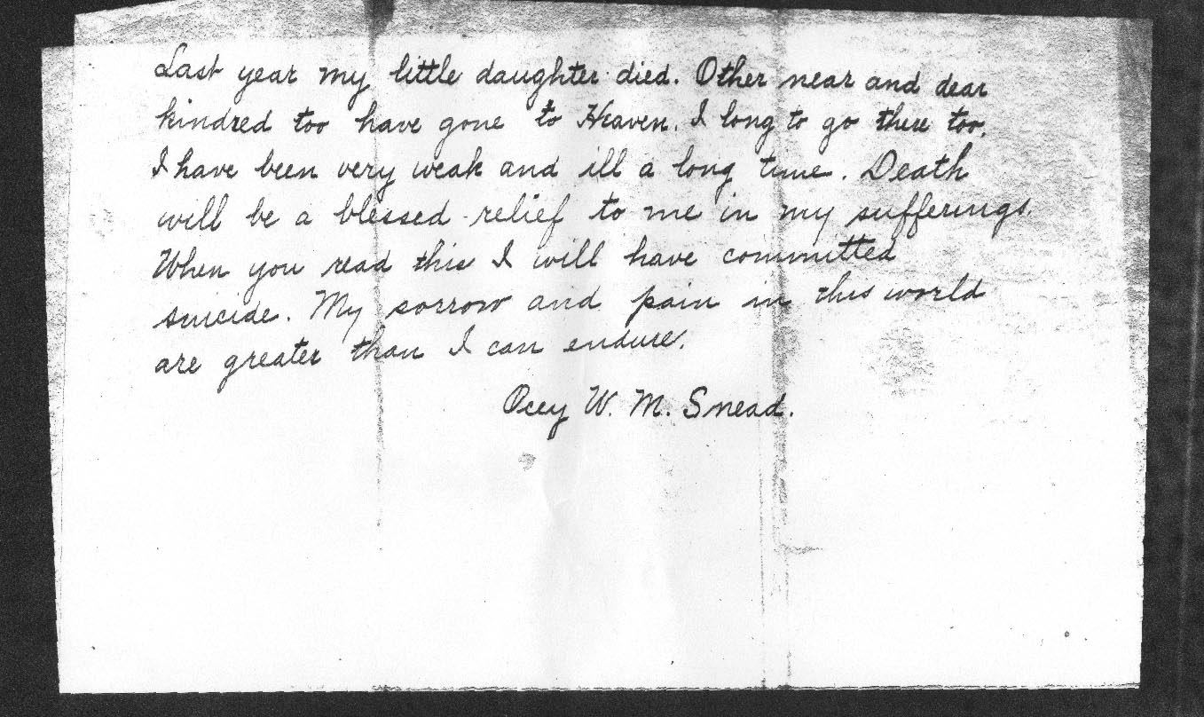 This May be an Photograph of Ocey's Snead's Actual Suicide Note