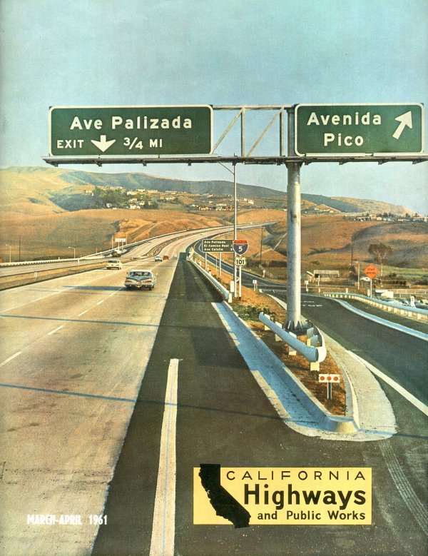 Diego. In 1960, San Clemente was a sleepy town of only 5,000 persons. Even so, it was a major bottleneck for through traffic between Los Angeles and San Diego. It was the last remaining section of US 101 in Los Angeles and Orange Counties that had not bee upgraded to expressway and freeway standards and was a narrow four lanes between San Juan Capistrano and the San Diego County line. Right: The San Diego Freeway through San Clemente is featured on this cover of California Highways and Public Works, March-April, 1961. The view is looking south. |