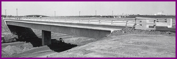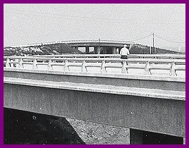 ![]() (Photographs courtesy of Caltrans Library) Above: South interchange between US 101 and Business US 101, 1953. The AT&SF grade separation is visible in the background. Right: The AT&SF grade separation viewed from the Business US 101 overcrossing. Below Left: Old Business US 101 overcrossing (Palomar Airport Rd overcrossing) in 1953. In 1966, this interchange was completely reconfigured to today's appearance (Photo courtesy of Caltrans) Below Right: Same intersection as it appeared in 1998 Note how the former freeway has been modified and how the concrete was paved over. |