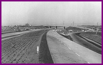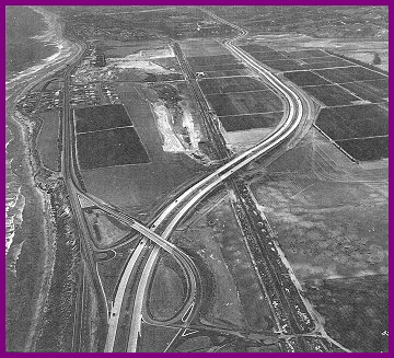 Freeway / Business US 101 Separation (South) This photograph, facing north, shows a lot about the original Oceanside-Carlsbad Freeway. The interchange between "Freeway 101" and "Business 101" (the old alignment) is visible - "Business 101" followed the old alignment up the coast.. A section of the old three lane road, which exists today, is visible to the left of the concrete lanes at the bottom of the picture. The 1953 alignment starts close to the bottom of the picture and continues over the railroad grade separation. The separation, visible toward the center of the picture, no longer exists, having been removed for construction of I-5 in 1966. The section of freeway continuing in the background now forms the inner lanes of present day I-5. The coal burning power plant, a Carlsbad landmark, was under construction at this time and is visible off the old alignment, toward the top of the picture