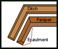 An epaulment was a mound of soil constructed to protect the open flanks of batteries from enemy fire. Some sources use the term to denote both the front and flanks of the parapet of a battery. | ||