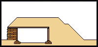 Any structure that was designed to be thick enough to absorb multiple direct impacts by solid shot and shell without impairing its power to resist penetration was said to be bomb proof. During the Civil War the term was used to refer to shelters built into or under the base of barbette batteries in larger field works where the garrison could shelter itself during bombardments. Bomb proofs were generally constructed from post and joist framing covered by one or more layers of plank sheating. This basic structure was then covered with earth thick enough to resist penetration. The illustration is based on a bomb proof magazine in the Fifth Parallel of the Federal siege lines on Morris Island, South Carolina. The posts were placed on sandbag foundations and the entrance was closed and protected by sandbags. | ||