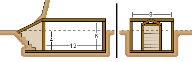 A central traverse that was about 16 feet above the natural level, 31 feet long, and 25' 6" thick separated the two gun platforms and was quite sufficient to resist the heaviest land based artillery fire that might be expected to be brought against the work. A fully framed magazine was almost naturally placed under the traverse and between the ramps leading up to the gun platforms where it was protected by the thick parapet from horizontal fire and the large traverse from vertical fire. The 8 x 12 foot chamber with head clearance of six feet was sunken four feet below the natural level and was, understating the thing a bit, relatively spacious for a two gun battery and may have been intended to double as a bomb proof shelter for the gun crews. The gallery was formed by a sharply rising stairway that economized space and decreased its vulnerability to vertical fire by limiting the area required for the gallery entrance, which was given a form rather similar to exterior basement entrances that replace the ceiling of the stairway with the opening to the outside. A pitched transom above the entrance helped keep water running off the rear of the traverse, loose bits of soil, and other rolling debris from falling into the magazine. Doubtless the entrance was also covered by a heavy door.