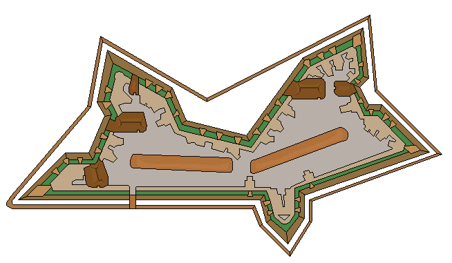 Fort Ward (shown in its 1864 incarnation) was one of the myriad enclosed works constructed for the defense of Washington, D. C. and is offered as an illustration of one method that could be used to integrate multiple magazines into a well developed semi-permanent field work. There were three large powder magazines and two smaller service magazines all of which were attached to the works' parapets, generally at the gorge of the work's bastions, and made to serve as traverses. All of the magazine chambers were well sunken and protected by substantial covering masses designed thick enough to resist heavy artillery fire. Covering masses of the three largest magazines were crowned with a parapet so that they could serve as interior retrenchments in the event that the enemy was able to mount the superior slopes of the salient angles and penetrate the interior of the bastions. Notice also that in all but one case the gallery entrances were turned to face the rear of the work; the other service magazine's gallery opened onto the terre-plein opposite the covering mass of one of the larger powder magazines.