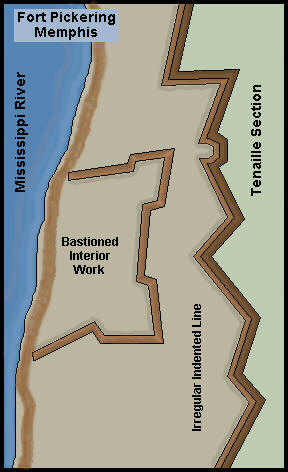 The main line of works composing the exterior defenses of Fort Pickering, at Memphis, Tennessee, was given the general form of an irregular indented line. One section of the exterior line was given a tenaille form that resembled Mahan's second arrangement for small redans with 60 degree salient angles. A small lunette designed with two flanks, two faces and a substantial pan-coupe was positioned between two long faces which angled forward to force the lunette into a retired position in the line. The long face to the north of the lunette joined another face to form a sharp salient angle. The collateral face to the south formed an obtuse salient angle which strongly resembled a redan. The limited and non-standard tenaille trace used at Fort Pickering was more typical of the use Civil War engineers made of the tenaille form: it was limited in extent, only composed a section of a longer irregular line, and was heavily modified to suit the fortification requirements of the site.