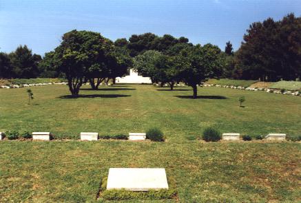 Embarkation Pier is on the North side of the mouth of Chailak Dere, at the North end of Ocean Beach (or North Beach); and the cemetery is a little way inland, between the beach and the road from Anzac to Suvla. Early in August 1915, this neighbourhood was occupied by the Headquarters of two Divisions, and later by a Casualty Clearing Station. The pier was made for the purpose of evacuating wounded from the Battle of Sari Bair, but it came under heavy rifle and shell fire and was abandoned after two days. The cemetery consists (except for five graves) of concentrations from the cemeteries known as Chailak Dere Nos. 1 and 2, Mulberry Tree, and Apex, and from isolated graves. Embarkation Pier Cemetery covers an area of 4,477 square yards; and it contains the graves of 13 named soldiers from New Zealand and 7 from Australia, and of 662 men whose names and units are alike unknown. Special memorials are erected to 118 soldiers from Australia, 93 from the United Kingdom (including many of the 6th Leinsters who fell in August in the Battle of Sari Bair), and 51 from New Zealand, who are known or believed to be buried among the unknown graves. Beyond the West end of the cemetery is a belt of cypresses, thirty feet wide; on the North and South sides are similar belts of pines; and cypresses are planted at intervals within the wall, with rosemary marking the Plots.