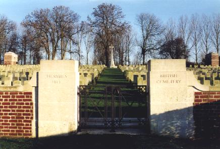 The village of Hermies was seized on the morning of the 9th April 1917, by a surprise attack of the 2nd and 3rd Battalions Australian Imperial Force (AIF). It was held against the advancing Germans on 22nd March 1918 by the 17th (Northern) Division, but evacuated on the following day. It was retaken in September 1918 during the final advance to the Hindenburg Line. Hermies was adopted in the 1920s, with Havrincourt, by the County Borough of Huddersfield. Hermies Hill British Cemetery was started in November 1917, during the Battle of Cambrai, and stayed in use by fighting units until March 1918; further graves were added in the following September. These original burials comprise nearly the whole of Plot I; the remaining three plots were added after the war by the concentration of 819 graves from a wide area round Hermies, and from certain small cemeteries (see below). The cemetery now contains the graves of 983 soldiers, airmen, and sailors and Marines of the Royal Naval Division, from the United Kingdom, and 43 soldiers from Australia, 7 from New Zealand and 3 from Canada. The unnamed graves are 297 in number, and special memorials are erected to 28 soldiers from the United Kingdom and 3 from Australia, known or believed to be buried among them. Other special memorials record the names of 6 soldiers from the United Kingdom, buried in two German Cemeteries, whose graves were destroyed by shell fire. The Register records particulars of 1,036 War Graves, existing or commemorated in the cemetery.