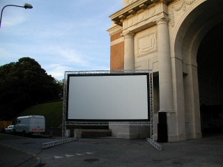 A huge screen is placed on the city side of the memorial to rely the events to those outside.