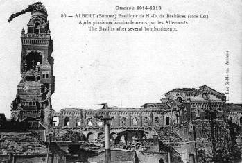 Albert was the main town on the Somme front, as far as the British were concerned. It acted as a staging post for units on the Somme, and it is likely that almost every British and Commonwealth soldier who fought in the 1916 battle passed through it at some stage. A railhead existed just outside the town at Dernancourt, there were Advanced Dressing Stations in an old factory and a familiar landmark was the church, or basilica. Only completed in 1912, Notre Dame de Breberies had a tall tower with a golden figure of Mary with her outstretched arms, holding the infant Jesus. In January 1915 the tower was struck by shell fire, one round hitting the statue itself. It thereafter hung at a roughly ninety-degree angle, and French Engineers wired it up to stop it falling into the square below. The legend grew that if the virgin fell, the war would end. When the British arrived on the Somme in the summer of 1915, it was christened the ‘Leaning Virgin’ or the ‘Golden Virgin’. Australian troops a year later christened it ‘Fanny Durack’ after a female Olympic swimmer who had won a gold medal before the war; they reckoned it looked like her diving into a swimming pool! Despite further bombardments, it did not fall until 1918 – when it was felled by British guns after the Germans captured Albert in March. The town wasn’t liberated until August, and by the close of the war was in ruins. Rebuilding started in the early 1920s, and the Basilica was restored to its former glory.