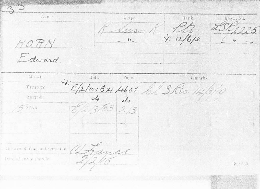 The MIC will tell you the soldier's name, his unit(s), rank and regimental numbers. It will also tell you what medals he was awarded (for descriptions of WW1 medals visit this website); the strange references against the medals are those used to refer to the Medal Rolls which are now in the NA under class WO329 (they are not available on-line). If a soldier was awarded the 1914 or 1914/15 Star, then the date he went overseas and theatre of war entered are shown. The Theatre of War is normally represented by a number: the most common are "1." which was France, "2B Balkans" which was Gallipoli, "5a" which was India, and "5c" Mesopotamia. The remarks box often includes some additional information, such as "K in A" for killed in action.