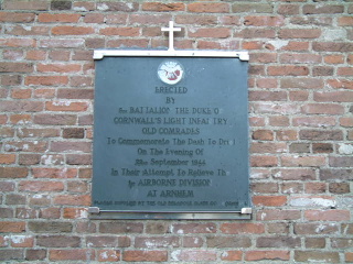 The memorial placed on the outside wall of Driel Roman Catholic church was placed there by the Old Comrades Association of the 5th DCLI.