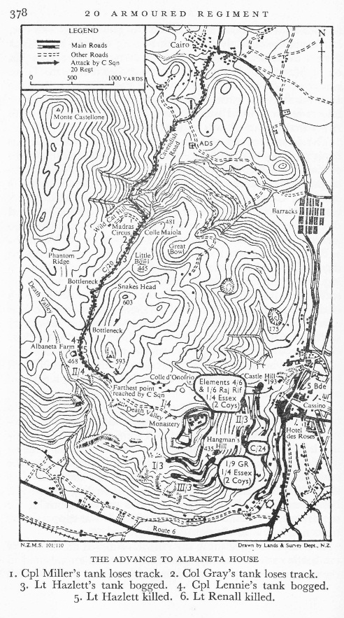 Albaneta Farm, or Albaneta House, or even 'The Nunnery' (although there never were ever any nuns here!), was an ancient farm complex below Hill 593 and on a 'back-door' route to the monastery of Monte Cassino. Occupied by German troops early in the fighting, it was the scene of heavy fighting on 19th March 1944 when the 20th Armoured Regiment of the New Zealand Forces pushed up through Cavendish Road in an attempt to launch an armoured thrust which would outflank the positions at Monte Cassino. German paratroops, dug in around the strongpoint of Albaneta Farm beat the tank attack, unsupported by its own infantry, back. In total nine tanks were lost, along with five dead and nine wounded.
