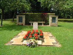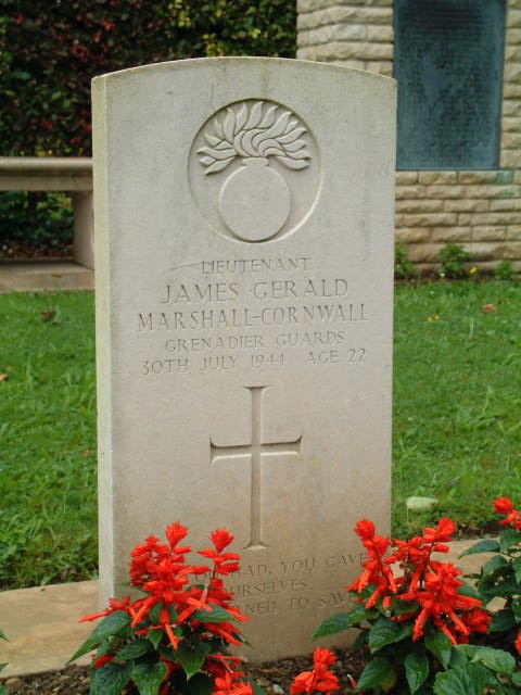Lieutenant James Gerald Marshall-Cornwall was commanding a tank when he was shot by a German sniper and buried on the spot. After the war the landowner gave the ground to the young officer's father, who requested that the grave site should not be disturbed. The CWGC erected a headstone on the soldier's grave, and the family added a memorial behind. This is the smallest military cemetery in Normandy, and probably of the Second World War.