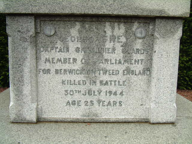 Captain George Charles Grey, 4th Battalion Grenadier Guards was killed on the opening day of Operation Bluecoat, 30th July 1944. His unit, part of 6th Guards Tanks Brigade, was equipped with Churchill VII tanks and advanced on the left flank from the Caumont l'Evente - Briquessard road, with 3rd Scots Guards on their right. Grey was killed in the advance on Lutain Wood, and buried on the battlefield by his men. The Grey family made the grave permanent after the war, and while many isolated graves such as this once existed on the Normandy battlefields, most were concentrated into military cemeteries post 1945. The Greys resisted this, and the memorial remains an official war grave to this day and known as the Livry Isolated Grave. Along with the isolated grave to Lieutenant James Gerald Marshall-Cornwall, it is a rare example of such a burial to a British soldier killed in the Second World War.