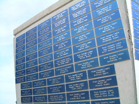 | Memorial to Canadian soldiers outside centre. | Memorial plaques donated by sponsors. | Typical Memorial plaque. |