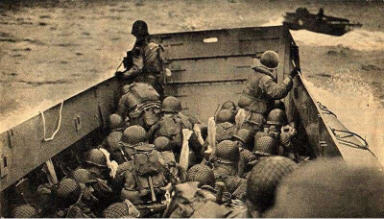 "As the first men jumped, they crumpled and flopped into the water. Then order was lost. It seemed to the men that the only way to get ashore was to dive head first in and swim clear of the fire that was striking the boats. But, as they hit the water, their heavy equipment dragged them down and soon they were struggling to keep afloat. Some were hit in the water and wounded. Some drowned then and there... But some moved safely through the bullet fire to the sand and the, finding they could not hold there, went back in to the water and used it as cover, only their heads sticking out. Those who survived kept moving with the tide, sheltering at times behind underwater obstacles and in this way they finally made their landings.
