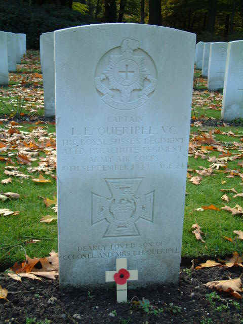 - VC Citation:"In Holland on September 19th, 1944, Captain Queripel was acting as Company Commander. When advancing on Arnhem, heavy and continuous enemy fire caused his company to split up on both sides of the road, and inflicted considerable losses. Repeatedly crossing and re-crossing the road under sustained and accurate fire, Captain Queripel not only immediately re-organized his force, but carried a wounded serjeant to the Regimental Aid Post, and was himself wounded in the face. Nevertheless he personally lead an attack on the strong point blocking their progress, and killed the occupants, thereby enabling the advance to continue. Later, Captain Queripel found himself cut off with a small party. Although by then additionally wounded in both arms, he continued to inspire his men to resist until increasing enemy pressure forced him to order their withdrawal. He insisted on remaining behind to cover their retreat with pistol fire and hand grenades, and was not seen again. During nine hours of confused and bitter fighting Captain Queripel unceasingly displayed gallantry of the highest order. His courage, leadership and devotion to duty were magnificent and inspiring."