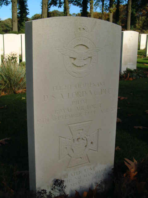 - VC Citation:"On September 19th, 1944, Flt. Lieut. Lord was pilot and captain of an aircraft detailed to drop supplies to our troops, who were closely surrounded at Arnhem. For accuracy this had to be done at 900 feet. While approaching the target at 1,500 feet the aircraft was severely damaged and set on fire. Flt. Lieut. Lord would have been justified in withdrawing or even in abandoning his aircraft but, knowing that supplies were desperately needed, he continued on his course. Twice going down to 900 feet under very intense fire, he successfully dropped his containers. His task completed he ordered his crew to abandon the aircraft, making no attempt himself to leave. A few seconds later the aircraft fell in flames, only one of the crew surviving. By continuing his mission in a damaged and burning plane, twice descending to 900 feet to ensure accuracy, and finally by remaining at the controls to give his crew a chance of escape, Flt. Lieut. Lord displayed supreme valour and self-sacrifice."