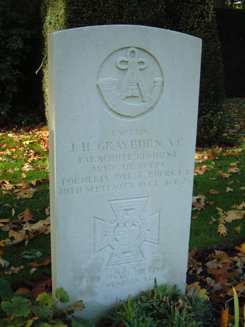 - VC Citation:"Lt. Grayburn was a platoon commander of the Parachute Battalion which was dropped on September 17th, 1944, with orders to seize and hold the bridge over the Rhine at Arnhem. He, with his platoon, was to capture the southern end. Lt. Grayburn was wounded in the shoulder almost immediately, but he directed and pressed the assault until casualties became so heavy that he was ordered to withdraw. Later, he successfully organized the occupation of a house vital to the defence of the bridge. Although heavily attacked throughout the next day and night, thanks to Lt. Grayburn's courage, leadership, and skill in disposing his men, the house was held until it was set on fire on September 19th, and had to be evacuated. Lt. Grayburn then formed a fighting force of elements of all arms, including the remainder of his company. Although wounded again, this time in the back, he refused to be evacuated. When tank attacks, against which he had no defence, finally forced his retreat on September 20th, he stood up in full view of the enemy, and directed the withdrawal of his men to the main defensive perimeter. He was killed that night. For nearly four days, despite pain and weakness from his wounds, shortage of food and lack of sleep, Lt. Grayburn displayed supreme and unflagging gallantry and determination. Without his inspiring leadership the Arnhem bridge could not have been held for so long."