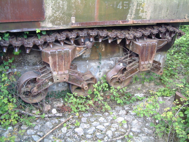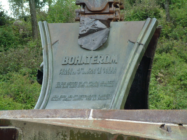 It is now minus it's main gun and machine-guns which the After The Battle team reported were still there in the 1970s. However, it is generally in very good condition, with much of its original paint scheme intact. The wording on the memorial states that it commemorates the 4th Polish Armoured Regiment and it can be seen that the tanks track links have been welded to form a cross (see above). Damage to the tank suggests it was knocked out by mines and not by any anti-tank weapons.