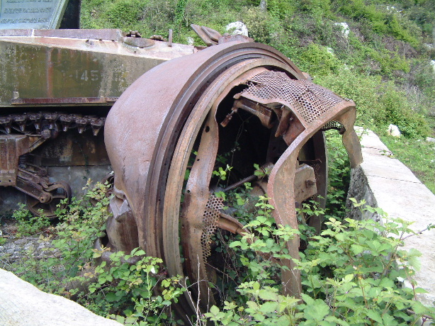 | General view of the memorial. | Close up of the memorial panel. | Sherman turret. | Track and bogie damage from mines. |
