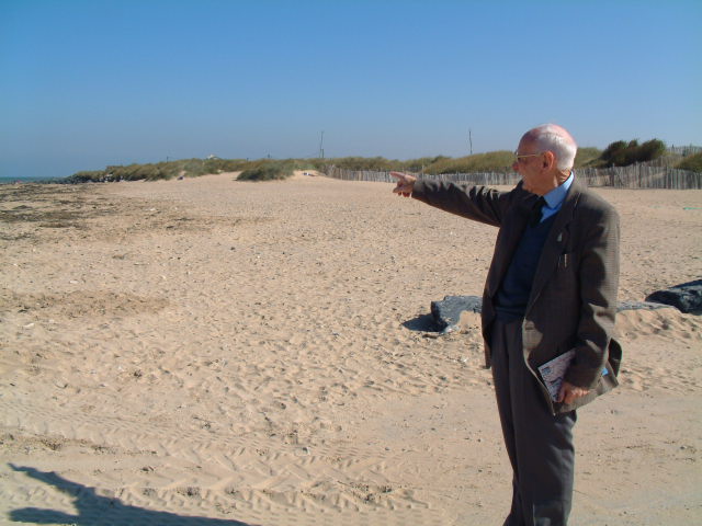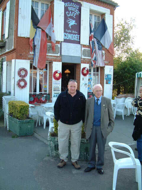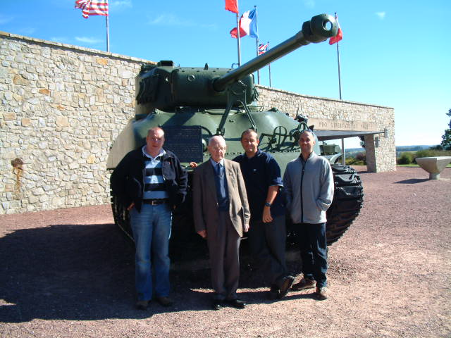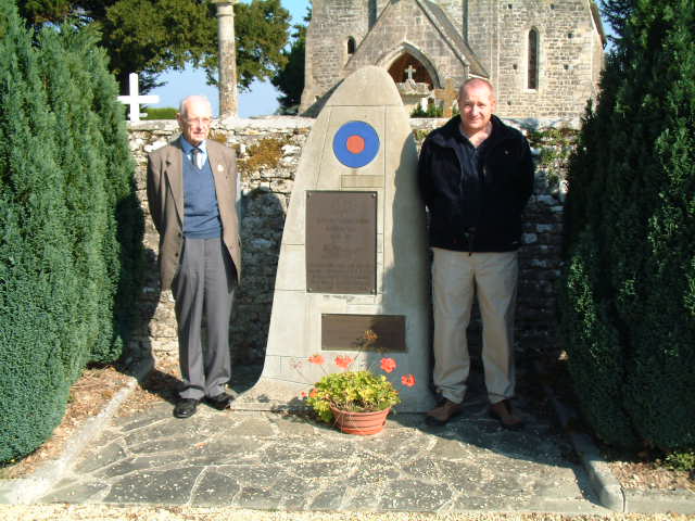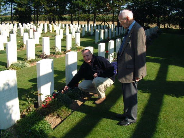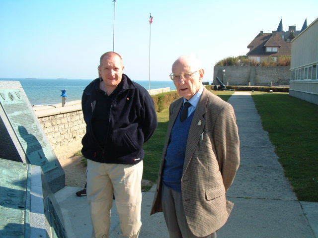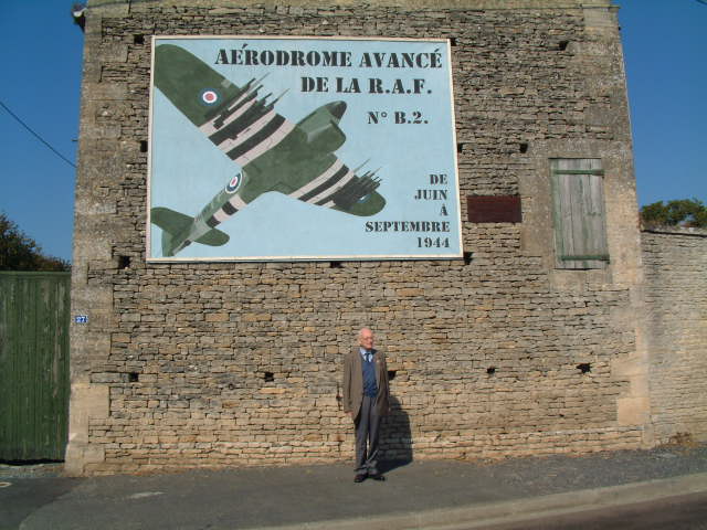 He returned to Normandy in September 2002 with his grandson, military historian and battlefield guide Clive Harris, for a weekend to revisit some of the sites where he served in 1944. We started at the excellent Bayeux War Museum, where Frank was interested to see their superb RAF display. Then we saw the remains of Mulberry Harbour before going down to Gold Beach at Asnelles, where Frank came ashore. Using the excellent Normandy Air War website we had obtained further details and a map of the B2 Advanced Landing Ground, and went out to there where Frank saw the location of the main airstrip. This site had also informed us about a nearby memorial, so we saw that before visiting the RAF graves in Ryes War Cemetery. The day ended at Pegasus Cafe for a drink before returning to the hotel in Bayeux. Frank was quite amazed at how much we had been able to see, and how much was left from the conflict in 1944. He also thought it great that WW2 veterans were allowed free into all the museums, and that they always made an effort to ask him what unit he was in.