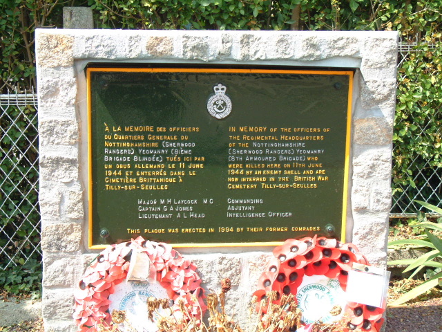 IN MEMORY OF THE OFFICERS OF THE REGIMENTAL HEADQUARTERS OF THE NOTTINGHAMSHIRE (SHERWOOD RANGERS) YEOMANRY (8th ARMOURED BRIGADE) WHO WERE KILLED HERE ON 11th JUNE 1944 BY AN ENEMY SHELL AND ARE NOW INTERRED IN THE BRITISH WAR CEMETERY TILLY-SUR-SEULLES.