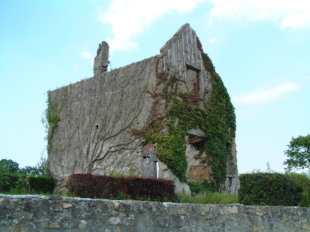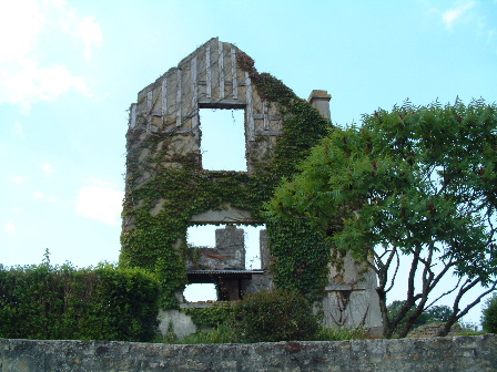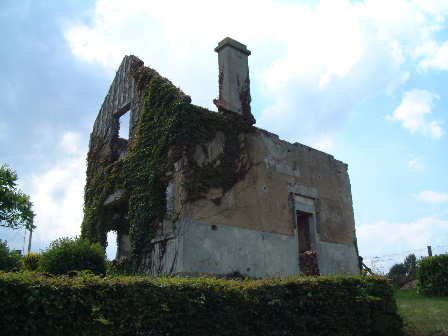 From the museum go west and join Rue du 18 Juin; here go left and follow the road out of the village - you will pass the village name sign. Continue to the next group of houses on your right, and you will see the ruined house. There is a locked gate, with enough room to pull off this narrow road.
