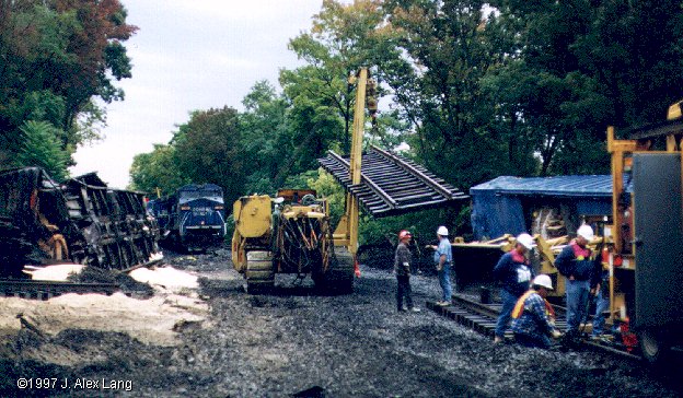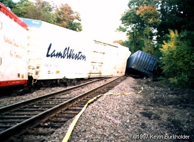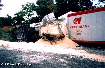 From the north side of the wreck, a severely mangled covered hopper has dumped its load of corn meal. |