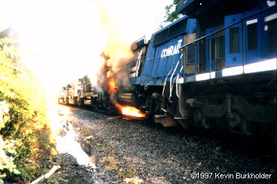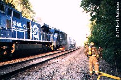 Looking east at the ENS-103 light engines, GP40-2 3301 is buckled and burning. |