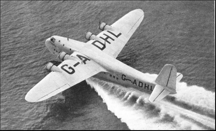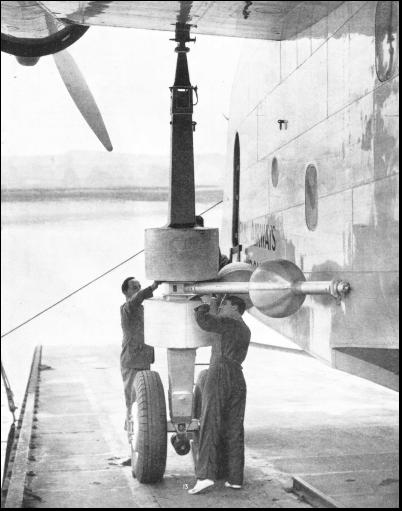 The cantilever wings of the Empire boat, as well as providing the lift and the lateral controlling surfaces, also house the four power units, the fuel and the oil tanks. The construction throughout is of metal and the main spars are built up in the form of a girder box. These "boxes" are tapered in depth as well as in plane towards their outer extremities. Round these spars are built a complicated system of struts, stiffeners and the tubular mountings for the engines. The whole of the wing is covered with light-metal sheet. A novel feature of the wing assembly is the way in which the leading edge and the trailing edge (that is the front and rear portions of the wing) are built up as separate units and attached bodily to the central portion comprising the spars. When these units are removed the entire internal structure of the wing with all its intricate details is revealed. The hinged outer sections of the trailing edge which form the ailerons for lateral control are fixed in the usual way, and flaps are arranged between the inner ends of the ailerons and the hull. The object of these flaps is to reduce the landing speed, and for this purpose they are lowered by the pilot as he makes his approach prior to alighting. The flaps are really retractable extensions of the trailing edge, and have a curved upper surface but are flat underneath. The flaps move in curved tracks, run on roller bearings, and are extended and drawn into their recesses by a form of screw jack that is rotated by a small electric motor. When the pilot wishes to operate them he simply moves a switch. The flaps are moved down in sixty seconds and returned in ninety seconds. The four engines are of the Bristol "Pegasus" type and develop 920 horse-power each, yielding a total of 3,680 horse-power. They are of the radial air-cooled type having nine cylinders. Each engine is surrounded by a streamlined cowling and is fitted with a three-bladed De Havilland variable pitch airscrew, which is to the aeroplane as the gear box is to the motor car. This device is controllable from the pilots' cabin so that at the take-off additional power is available, after which it can be adjusted to secure the most economical running while the machine is cruising. Alongside each engine there are two retractable platforms on which mechanics can stand to attend to the mechanism. The engines are started by electric starters and a hand turning gear is also incorporated. The fuel tanks are placed behind each pair of engines and are embodied in the wing. The standard capacity is 600 gallons, but additional tanks are fitted in the machines designed for the transatlantic service. On the under surface of the wing, at a point somewhat beyond the outer engine on either side, a float is attached on streamlined and wire-braced struts. These floats are to stabilize the craft when she is on the water; to prevent undue torsional loads reaching the wing, in the event of the floats being struck by broken water, the floats are fitted with shock absorbers. The tail unit of the Empire boat is built into the stern of the hull. The construction of the tail plane, the rudder and the elevator is similar to that of the main wings. Rudder and elevator are equipped with trimming tabs. These tabs are provided to set the altitude of the machine while in flight and to relieve the pilot of a proportion of the work of keeping the machine on her course. The tabs are operated by handle controls located in the pilots' cabin. The first batch of the Empire flying boats was delivered in 1936, after having undergone all tests with complete success. The Canopus and the Caledonia were the first boats to be launched into the River Medway at Rochester, Kent. Early in 1937 the Centaurus, the Cambria and the Cavalier added their names to the Empire fleet of flying boats. When the entire fleet is in service between Great Britain and South Africa, along the great England-Australia route and even across the Atlantic, these craft will be linking up the Empire as never before and another page will have been turned in the brief but eventful history of aviation.
