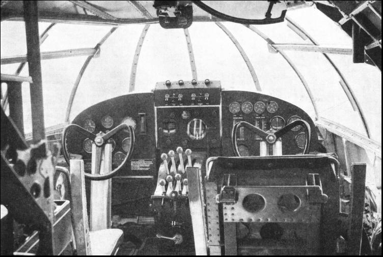 Immediately behind the semicircular glazed front is the instrument panel, with its elaborate array of engine and navigation instruments. Mounted on the top of the panel are the four starter switches and ignition switches for the engines, and in the centre is the "auto" pilot, a wonderful piece of apparatus which automatically keeps the plane on a predetermined course. The other instruments include a rate-of-climb indicator, engine revolution indicators, sensitive altimeter, air speed indicators, homing indicator, directional gyro, artificial horizon and dual compasses. This complicated installation may seem bewildering, but every instrument is a vital and essential component. Combined with the special radio plant that is installed in another compartment, the entire equipment makes the great flying boat almost independent of the outside world when flying on her long and lonely routes. Behind the instrument panel are the seats provided for the captain and his first officer. The flying controls consist of the orthodox control column and rudder-bar apparatus. The control column is surmounted by a wheel which operates the lateral controlling surfaces and forward or backward movement of the column actuates the elevators. These controls are duplicated, and between the two sets the engine control levers are grouped. These levers are centrally placed so that either pilot can operate them. They consist of four throttle levers, four mixture controls, a master switch for the automatic pilot and two "cut-out" levers. The "cutout" levers are for the purpose of making the engines dead after switching off. Other controls disposed near the pilots' seats are the airscrew pitch controls, fore-and-after trimmer, rudder bias, fuel supply cocks and the switch for operating the wing flaps. Arranged round the cabin behind the pilots' seats is further equipment. On the starboard side there is a panel containing gauges showing the temperature of the engines; on the opposite side there are the gyro pilot unit, auxiliary electric generators and the directional loop for the wireless direction-finding receiver, near which the radio operator is seated. Behind the starboard pilot's seat there is a skylight which can be opened. This allows the navigator to make his observations without difficulty, as the aperture is provided with a wind-screen which protects the navigator from the rush of air. Radio Operator's CabinCONSIDERING the great size of the Empire flying boat, her immense power and her elaborate equipment, it is astonishing that one man can fly the machine single-handed. In regular operating conditions the duties are divided between various members of a crew, but on the initial test flight of the first Empire boat Shorts' test pilot, Captain J. Lankester Barker, was alone in the machine. The pilots' cabin is partitioned off from the radio operator's cabin by a sloping bulkhead and door. The operator sits with his back to the pilots and is in charge of a transmitting set and a, receiving set which operate on wavelengths of 600-2,000 metres and 16-75 metres. The directional loop can be projected from or retracted into the compartment by a simple mechanism, the object being to reduce drag when it is not in use. There is also a trailing aerial which, when not in use, is wound on a drum. When it is drawn up an automatically-closing flap seals the aperture through which it passes. In addition to the trailing aerial there is another one arranged in a "V" on the top of the wing and the hull. By means of this aerial the radio operator is able to pick up signals and calls while he is transmitting, for as soon as he releases the key of his transmitter his headphones are connected to the receiver. The pilots' cabin and the radio room are located in the upper deck—for the flying boat has two decks within her hull.