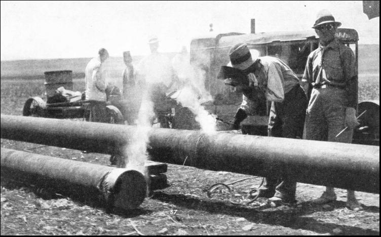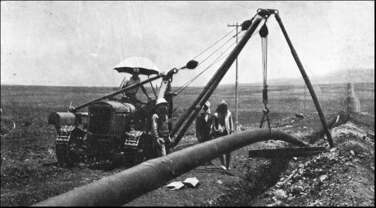 The wire brushes removed all dirt and rust, leaving a clean steel surface on which the coir brushes deposited an undercoating of primer. When that had dried, a protective enamel was applied by hand. Hot enamel was ladled on to the upper side of the pipe, and as it ran down it was spread evenly by a strip of canvas passed under and round the pipe and worked backwards and forwards. A remarkably even distribution was obtained, and the entire pipe was finally wrapped in asbestos. With such great lengths of metal, in a land where temperatures vary so widely between day and night, and in summer and winter, it was necessary to allow for an unusual amount of expansion and contraction. This was done in an ingenious manner. At points seventy yards apart the pipe was supported on skids slightly above the level of the trench, and allowed to sag. This meant that the pipe was slightly longer than the trench it was destined to occupy. If it could be forced down under compression to an even level, allowance would then have been made for a certain degree of contraction.