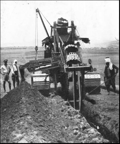 The men learned to dread the dust storms, which sometimes lasted for days, entirely blotting out the camps. The storms were particularly severe in the lava country. Here, almost without warning, blinding and suffocating dust would rise and envelop the lorries and even the camps. Drivers were blinded for hours on end by these dust storms, which prevented their seeing more than a yard or two ahead. Worse still, the grit and sand got into the engines and brought all transport to a stop. Dust invaded the tents, the bedding and the food. In the summer and autumn the heat was intense, the thermometer registering 120° at mid-day. This would be maintained for weeks on end with no shelter or shade of any kind. At night, in the winter, the thermometer would drop far below freezing-point. As one worker aptly put it : "Out in the desert here we are either being baked or frozen." Thus the men toiled day after day, week after week, in the lonely wastes, seeing little life, and being cut off from the outside world save tor the occasional arrival of a messenger from another camp. They were followed by the ditchers and welders. The pipe line was to be buried throughout its entire length. The first operation, therefore, was the digging of an adequate trench. To have employed manual labour would have taken far too long, the plan being that the laying of the pipes should not occupy more than a year. That the work was carried out in that time is evidence of the elaborate preparations which were taken before it was put in hand. The trenches were mechanically excavated by ditching machines. These consisted of a crawler tractor bearing a power unit which operated an excavating wheel overhanging the rear of the machine. The wheel was equipped with steel buckets which picked up the soil—including boulders fifteen inches in diameter—and dropped it on to a conveyer belt which threw it neatly and continuously beside the excavated trench.