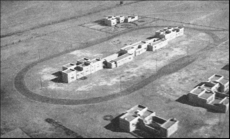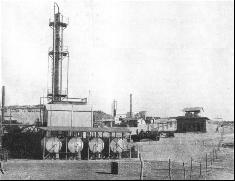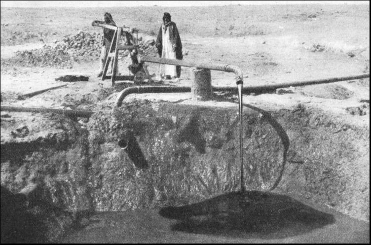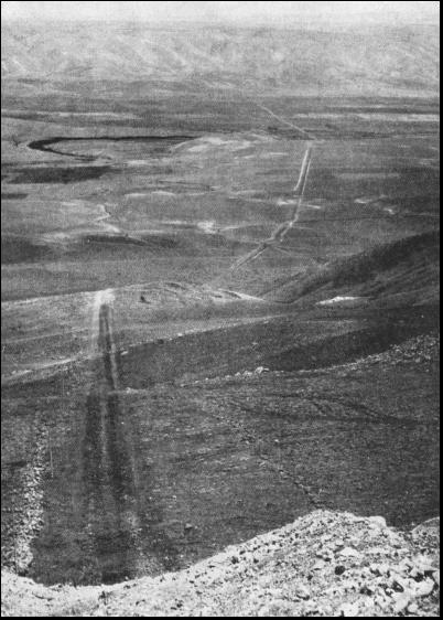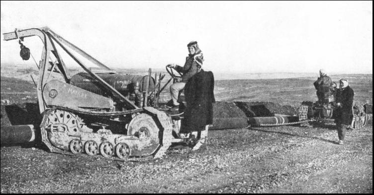 The skids were removed and the pipe forced down to the determined level by loaded crawler tractors. There is no possibility of the pipe contracting sufficiently to pull it apart, even in the coldest of weathers. When the pipe was in position, the soil was rapidly shovelled into the trench and rammed down hard. Thus the great pipe line lay securely at the bottom of its trench, providing a smooth transit for the passage of oil, protected from corrosion and immune from vagaries of temperature. After the line had been laid only a slight disturbance of the ground marked its route. Along it to-day stretches an apparently interminable row of telegraph posts, running without deviation from horizon to horizon. Between the posts copper wires glint in the sun. The posts and the wires form a track, visible for many miles on the surface or from the air. This track, if followed by a traveller from Haifa or Tripoli, would eventually lead him to the Euphrates—to water, shelter and roads. Never before has a path across the desert been so plainly marked.