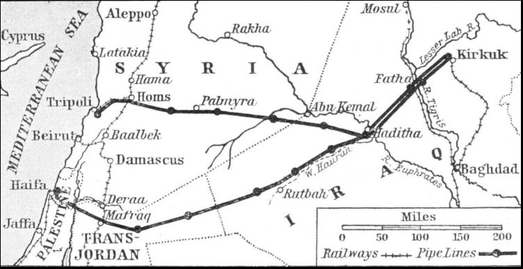 Having tapped oil and learned something of ths vast quantity available, the next thing considered was how best to transport it to the markets of the world. The British Navy was looking in the Mediterranean for an oil depot on which its ships could rely for their fuel, as was also the French Navy. After long and careful study the engineers decided to pump the oil through two pipe lines, one to Haifa in Palestine, and another to Tripoli, in the French Mandated Territory of Syria. It was to be a costly proposition, but with a pipe line capable of handling 4,000,000 tons of oil annually, there was every reason to believe that the venture would be a financial success. Almost a year was spent in the desert surveying possible routes and determining those which were finally chosen. Nearly the whole length of the pipe lines had to pass through desert wastes, without roads or railways, having only a few settlements, and uninhabited save by a few scattered nomadic Bedouin tribes. Water existed at certain points, but it was inadequate in quantity and quality. Ultimately two routes were selected. For the first 156 miles, from Kirkuk to Haditha on the Euphrates, the two sections of the line run together. At Haditha they separate. The southern one continues through Iraq, Transjordan and Palestine to Haifa, and the northern one through Syria to Tripoli. The length of the Haifa pipe line is 620 miles, and that of the Tripoli line 530 miles.