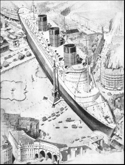 From such small beginnings the Queen Mary was evolved, a ship of beautiful lines with a sloping stem, cruiser stern, and fore and aft rig, and with three raked funnels adding a final touch of dignity. The forward funnel is over 70 feet in height from the boat deck, the remaining two being set lower. The circumference of each funnel is nearly 100 feet, the larger diameter 30 feet. So large are the funnels that three big express locomotives could be run abreast through any one of them. Figures alone cannot convey to the mind the enormous size nor the majesty of this, the latest and most up-to-date of the world's liners. World-famous structures drawn to scale, with the Queen Mary alongside or amid them, appear pygmy-like in comparison. Elucidating the size of this ship is in itself a difficult problem without bringing in the aid of known images for comparison. The illustration below has been prepared to give an adequate impression of the magnitude of man's latest and boldest shipping achievement. The Nelson Column, Trafalgar Square, London (170 feet high), is shown on the starboard side, the crown of Nelson's hat just overtopping the boat deck. Her stern, assuming it possible to lay the ship down in this position, would push in the walls of the Garrick Theatre in Charing Cross Road and her stem would protrude into Whitehall. If we consider the ship in relation to Westminster Abbey, the top of the Abbey towers would not reach to the top of her mainmast. The top of Magdalen Tower at Oxford (145 feet) would come half-way up to the middle funnel. The upraised hand of the statue of Liberty (151 feet from the top of the plinth), New York Harbour, would reach just above the bridge. These comparisons help us to gain some idea of the proportions of this remarkable vessel.