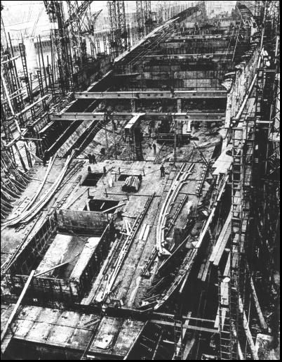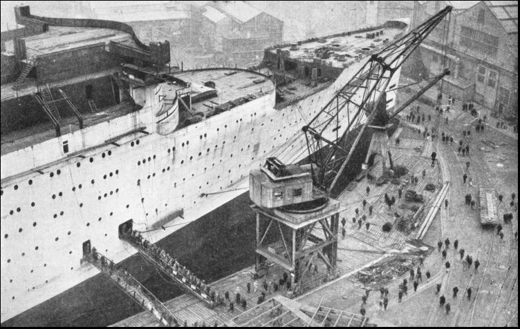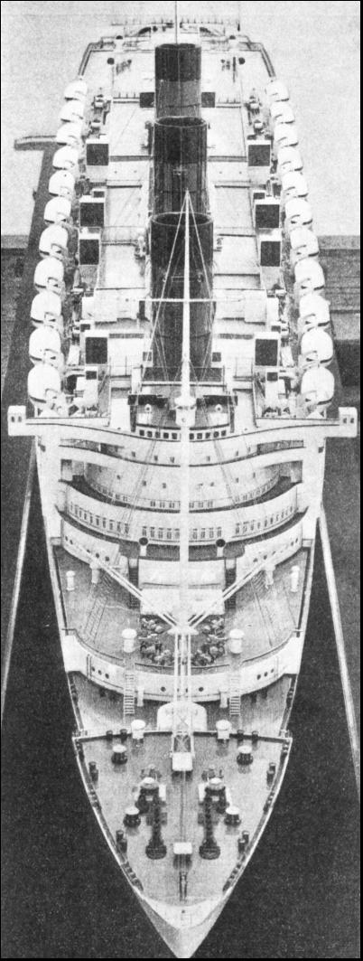 Numbers, too, can in some ways stimulate our imagination. Official records show that ten million rivets, weighing 4,000 tons, have been driven into this ship ; twenty-seven great boilers occupy five rooms, and over 2,600 feet of main steam piping lead from the boilers to the main and auxiliary machinery. The electric power supplied by seven turbo-generator sets, developing 10,000 kilowatts, is sufficient to supply lighting and public services for a town of the size of Brighton (population 147,427). Let us still play with the magic of figures. The structure comprises twelve decks, including the partial lower decks, which are discontinued across the extensive machinery spaces. The total weight of metal in the hull and machinery is more than 50,000 tons. About 2,000 portholes and windows are cut into the plates. A Thousand Feet of SteelLET us remember that these staggering figures go to make up but part of the Queen Mary, listed simply as No. 534. The extraordinary amount of preliminary theoretical work is one of the most notable features in designing super-ships. The structure is often called upon to meet stresses and strains of phenomenal force. When the Queen Mary pushes her thousand-odd feet of steel over the Atlantic Ocean she must at all times be ready to meet watery caverns a thousand feet wide, her whole structure poised here and there, or part buried in lashing seas.