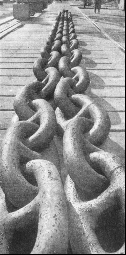 All the fixed loud-speakers are built into the panelling of the rooms and made to tone with the decorative scheme. A local volume control for each loud-speaker group enables the volume to be adjusted independently of the input panel volume controls in the control room, the arrangements throughout being such that the quality of the sound reproduction will always be of the highest possible standard. This, in conjunction with the alternative programme facilities, will ensure that the varying tastes and requirements of the passengers will be met in every way and at any time. We will now consider some of the problems that have to be faced in the building of a ship of the size of the Queen Mary. Reflect on the man who is guiding a machine that is cutting steel shavings from the 3-ft. shaft which will form the driving centre of the lower-pressure turbine on one of the four propeller shafts. An error by this man would cost the builders about £15,000. Consider the two great anchors, each weighing sixteen tons. These are among the largest that have ever been made for an ocean liner, and they are recessed into the bows to obviate wind resistance. The anchor chains are of 165 fathoms (990 feet), weighing 145 tons. The testing of these chains was of considerable importance. A three-links piece of chain was subjected to a strain of nearly 700 tons—an excess of over 400 tons necessary for official requirements. Consider, too, the cable necessary to carry electric energy. There are 4,000 miles of such cable—a cable that would stretch from New York to San Francisco and 800 miles beyond. We have seen that many experiments were made with the hull. The three large funnels, too, were made to scale, and subjected to every kind of test with smoke-producing apparatus in a specially constructed wind tunnel. No smoke must be allowed to descend on to the promenade decks to interfere with the comfort of passengers. Thus it was necessary to conduct dozens of experiments before the final designs and heights could be finally approved.