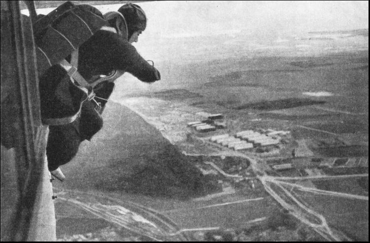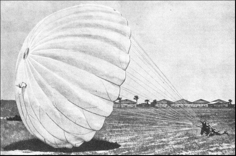 So rapid is the process of opening that it is not possible to observe it accurately with the eye. It has been filmed with a slow-motion camera, and the film shows that the air in the upper part causes the canopy to open from the apex to the periphery. The shrouds are pulled clear from the pack to the loop rings, and these pull the connecting webbing above the parachutist's head so that the strain is taken by the harness. The user has now completed two stages of the descent : jumping or diving clear and releasing the parachute. He now begins the third stage : controlling the descent. He settles himself comfortably in the seat of his "swing." If he is a little too far forward he places his thumbs in the seat strap beside either leg and presses downwards, thus pushing his body upwards and back into the harness. If he is too far back, a movement in the forward direction is equally simple. If there is any danger of his landing on buildings or. among trees, he can alter the angle of gliding by side-slipping. If he wants to move to the right, he tugs the two suspension straps on his right side downwards. This action depresses the shrouds and spills some air from the left side of the canopy, causing the parachute to move to the right. The action accelerates the rate of descent. The canopy opens fully again when the rigging lines are released. A parachute naturally lands with the wind, and the parachutist therefore aims to face the direction of drift during the descent, so that he can see where he is going. If he is drifting backwards he turns the parachute. He tugs the shrouds to pull down the edge of the canopy in the direction in which he wishes to turn and then grasps the shrouds on the opposite side and, without pulling down, gives the parachute a twist, in the desired direction, turning it. He is successful, and passes on to the fourth stage of the descent, the landing.