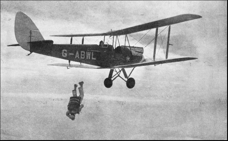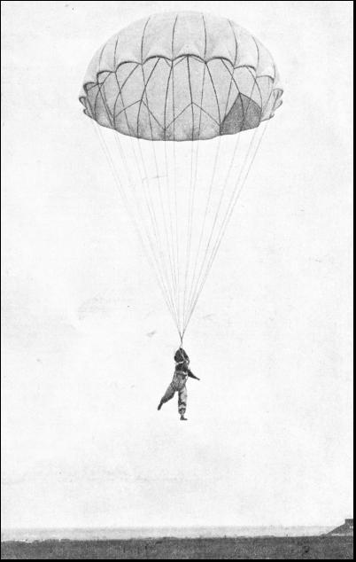 These parachutes were attached, opened, to balloons, but in the eighties professional parachutists began to experiment with flexible parachutes. The outstanding practitioner was Major Thomas Baldwin, an American, for it was he who solved the problem of oscillation. Baldwin made a hazardous exhibition descent from a balloon, swinging wildly, like the pendulum of an erratic clock. He and the crowd were astonished that he landed alive. This gave Baldwin the clue. He rediscovered the use of the vent, which Garnerin had embodied in his first parachutes. Until Baldwin produced his parachute, the parachutist was swung to and fro in the air like a man on a flying trapeze. The air was compressed under the apex of the canopy and could not escape ; thus descent was tardy and the parachute was blown hither and thither by side-winds. The vent eased the shock when the folded parachute opened, and it enabled the parachute to descend without swaying violently in the air currents. Parachutes were satisfactory enough until the aeroplane was invented. To make a descent from an aeroplane was found to be a somewhat hazardous adventure. Several men tried it, among them Adolphe Pegoud (1887-1915), and Leslie L. Irvin, about ]911. Irvin's parachute was folded and was packed loosely in a sack which was made fast to the aeroplane. Irvin was attached to the parachute by a line. When he jumped from the aeroplane his falling weight pulled the parachute clear of the sack, the parachute opened and Irvin descended. He proved that a man could jump from the machines of 1911 without upsetting them. The first parachutist to make a successful descent, from an aeroplane in England was the late William Newell, at Hendon, in May 1914. Escaping from Captive BalloonsOTHER successful jumps followed. Then came the war of 1914-18. The parachute was a reliable means of escape from airships and particularly from the observation balloons used on all fronts. When a balloon was set on fire by hostile aircraft the observer jumped with his parachute. It was considered unsportsmanlike for an enemy aviator to machine-gun the parachutist; a Hague Rule specified that a parachutist should be spared during descent. Various parachutes became well known, among them being the types produced by E. R. Calthrop. Calthrop resolutely tackled several difficult problems, especially that of escape from an aeroplane at low altitudes. As a test two parachutists jumped from Tower Bridge, London, in November 1917, and the parachutes opened and lowered them without injury into the Thames, despite the fact that the drop was only about 140 feet. In other countries the quest for reliability was keen, but despite all efforts one fact was obvious. Men who jumped with parachutes from aeroplanes had a high rate of mortality. The parachute which was a success when used from observation balloons was not to be relied upon by aeroplane pilots and observers. The parachutes were attached to the aeroplane or were folded in a container. As the pilot jumped or was flung from the disabled aeroplane the line connecting his harness with the parachute pulled the canopy out of the container—sometimes, but not always. Often the machine was spinning, or was so badly damaged, that the line of the parachute would foul a part of the aeroplane and thus fail to operate.