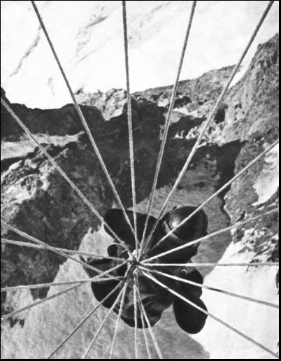 The ring is housed in an elastic-mouthed pocket, and is attached to the rip cord, a steel cable in a flexible housing. The end of the rip cord passes through two locking cones on the pack. The sharp jerk pulls the cord out. All four flaps of the pack cover fly open under the. action of elastic, the resilience of the tightly packed silk and the spring frame of the auxiliary parachute. The auxiliary springs out like a Jack-in-the-box and opens in a flash. The air pressure and the weight of the falling parachutist do the rest. The resistance of the air on the auxiliary pulls the main canopy, apex first, in a long fold from the pack. The rim of the main canopy begins to open, generally before the rigging lines are fully withdrawn from their pockets in the pack. The air rushes up with great velocity into the canopy but cannot escape until it has forced open the upper part.