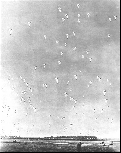 He retains the sitting position in the harness with the muscles of his body fully relaxed. He raises his arms up two of the suspension straps to the full extent. At the instant that his feet, which are still bent with all the muscles slack, touch the ground, he pulls down on the straps with his hands to help to absorb the shock of landing. He makes no attempt to stand. He sinks to the ground and rolls, if necessary. Conditions may not be favourable. He may be making a landing in a strong wind. If this is so, when he is about 100 feet from the ground, he gives the dial of the quick release box of his harness a quarter turn, unlocking it, but not opening it. Immediately his feet touch the earth he strikes the dial smartly with his hand. This knocks all four plungers from the eyes in the harness connexion lugs, releasing the parachutist from his harness. Relieved of his weight, the parachute blows clear. The aviator retrieves the parachute as quickly as he can and rolls it up to prevent it from being carried by the wind against obstructions that will damage the silk. If he has to alight in water, the parachutist endeavours to free himself of the parachute the moment his feet enter the water. He turns the dial just before the crucial moment, puts his feet together and stiffens his body. He punches the dial with one hand, while with the other he pinches his nostrils to prevent the water from rushing into them. At the same time he keeps his elbows pressed close to his sides to avoid injury.