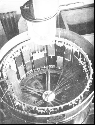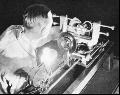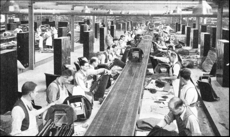 Experimental radiators are tested in a special plant. This reproduces all kinds of road and weather conditions likely to be experienced in any part of the world where a car can be used, whether in the tropics or in the Arctic, in a dead calm or in a ninety-miles-an-hour hurricane. The same car may be experimentally fitted with different types of radiator, with a view to obtaining the best result. The effects of changes of radiator can be noted on such points as the radiator temperature grading, the air temperature before and after the air has passed through the radiator, the horse-power of the engine and the petrol consumption. There is a hydraulic test to ensure the resistance of the radiator to pressure, and an expansion test, which involves placing the radiator into cold water and steam alternately for long periods. Radiators to be used in conjunction with water pumps are put through a water flow test. Then there is the vibration test. The radiator is bolted to a spring-loaded plate which is struck violently and rapidly by a mechanically operated cam which produces a "shake-up" more violent than that experienced on the worst road known to motorists. From time to time radiators are taken off the production line and drastically tested to make sure that they are up to standard. At Cowley the multitude of tributaries converges on the main stream, which comprises five main assembly lines fed with components by conveyers, overhead travelling cranes or sub-assembly lines. All components are delivered as near as possible to the point of assembly. Timing and organization not only ensure that parts are always at hand when wanted, hut also avoid large accumulations of stock. All parts are examined and checked before they are placed in the stores. By means of master gauges each part is measured as it arrives to ensure standardization and to make certain that no defective component reaches the assembly line. The testing laboratory at Cowley, with its array of instruments, checks all outside sources of supply. The laboratory tests are comprehensive. Samples from every batch of fabrics used for the interior trimmings of the car are subjected to a tensile test where the fabric is stretched until it breaks. The force required is then compared with the standard figure. The test for fading is carried out in a special machine which concentrates about two years' English weather into less than a fortnight by the aid of intense artificial sunlight and varying degrees of humidity. Round the cylinder of this weather machine are scaled containers. Samples of fabrics are fitted into the containers and exposed to the rays of the daylight lamp and to artificial rain created by revolving jets of water. At the end of the test, if the sample is up to standard, no sign of fading can be seen by the human eye. Secret-Revealing LampTHE human eye test, however, is not sufficient. The sample is taken to another ingenious device, a mercury vapour lamp, whose rays immediately disclose secrets invisible in the rays of the sun. Fading or discoloration, otherwise invisible, is disclosed by the tell-tale lamp. This device is used to check fluids as well as solids. Samples are taken from black enamel, turpentine, oils, polishes and other supplies and placed in the rays, which reveal any adulteration even if it is as slight as 1 or 2 per cent. The difference, invisible otherwise, between the colour of the standard and that of the sample is shown by the revealing light. Horsehair, as used for upholstery padding, is first weighed and then boiled in a caustic solution which dissolves the hair and leaves any impurities, which may be present, unaffected. The solution is then filtered to isolate the adulterating materials so that the percentage of these can be determined.